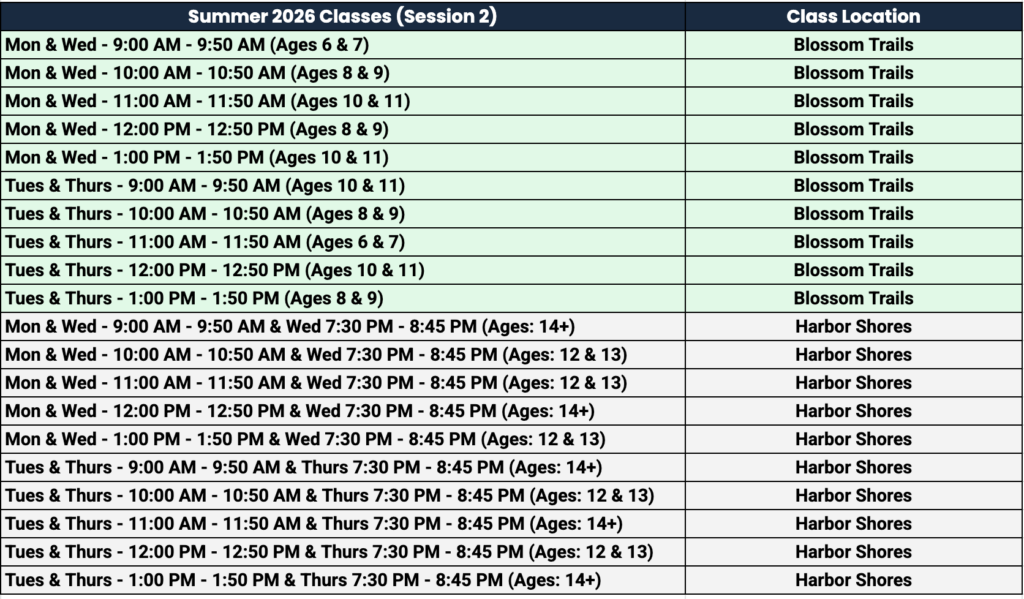 Session 2: July 20 – August 13 (no classes August 3 & 4 due to the Whirlpool Community Charity Golf Event)