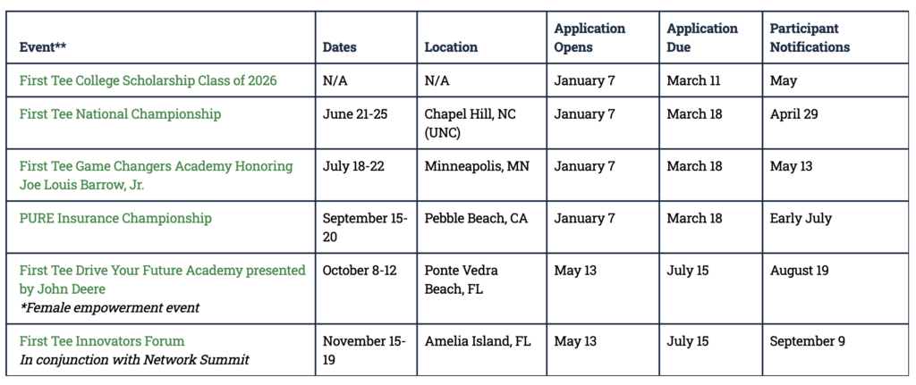 First Tee doesn’t just get kids on the course, it offers them exciting opportunities for growth. With the help of our corporate partners, we host a series of events for our participants, allowing them to meet new people, play some golf, and achieve greatness. Descriptions and selected individuals are listed in the dropdown boxes below.